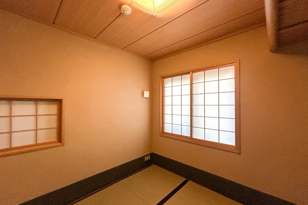 まずは1Fのご紹介から。柔らかな光が障子越しに広がる、落ち着いたトーンの和室。