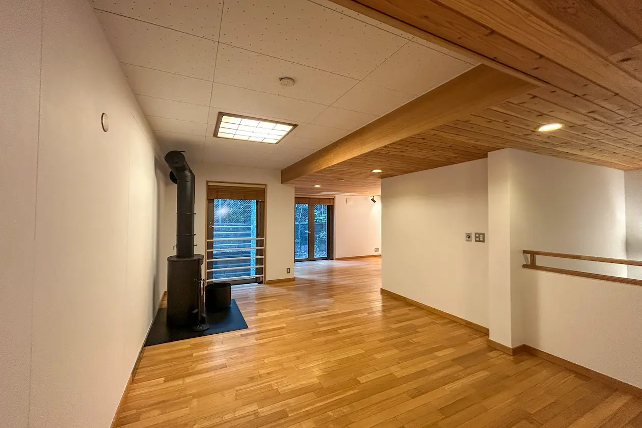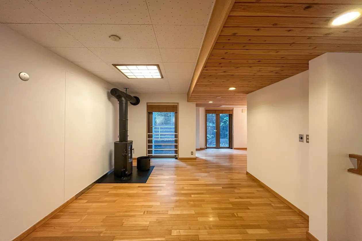 こちらは1FのLDK。アイコン的に置かれた薪ストーブが空間の主役で、ここにしかない山荘のようなぬくもりを感じます。