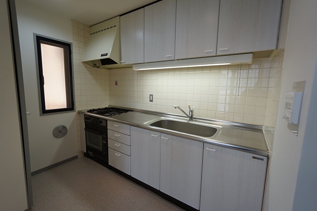 2口ガスコンロの広々したキッチン。部屋からあまり見えないような配置になってるのはポイント。