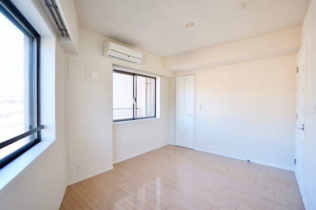 こちらは7.4帖の洋室、2面採光で明るさも十分です。コンパクトな空間を補うようにウォークインクローゼットが付いています。