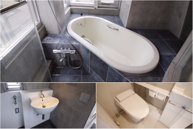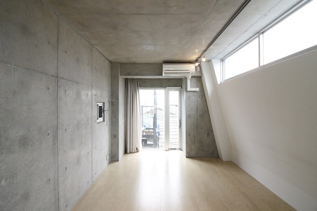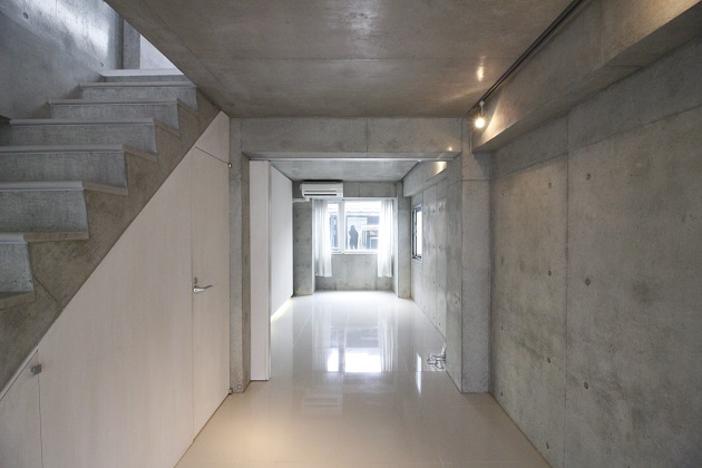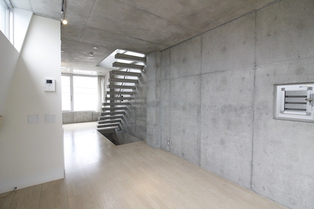 メゾネットの階段部分もコンクリートでできており、細部までデザイナーの拘りを感じる内装。3階にはキッチン、階段上った4階にはお風呂場やバルコニーがあります。