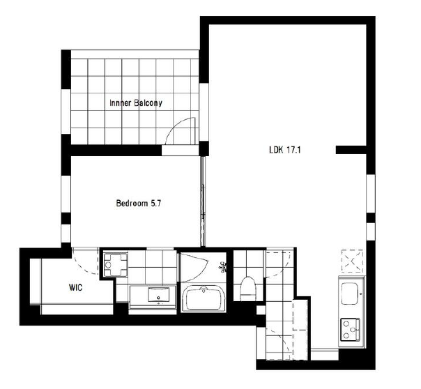 室内は1LDKプラン、17.1帖の余裕ある広さのLDKと5.7帖のベッドルームという構成。