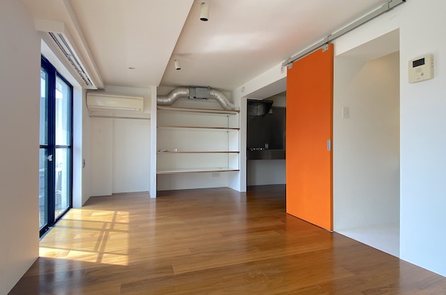 オレンジ色の引き戸が空間のアクセントになっています。扉の向こうは水周りエリアとなっています。