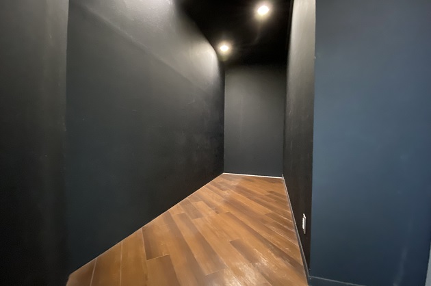 ブラックの壁天井に赤茶色のフローリング材が敷かれたシックな内装。