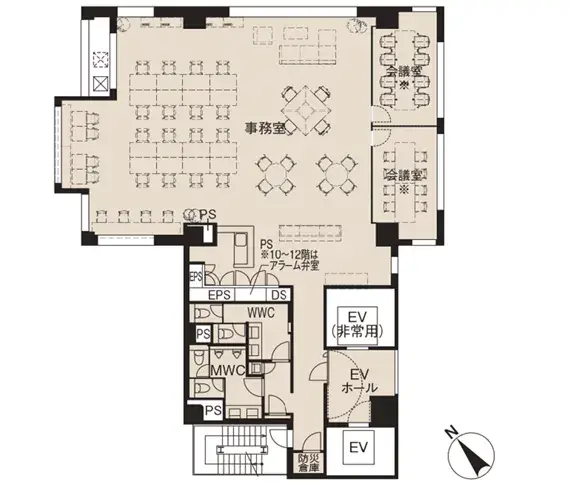 執務スペースはワンフロア30〜40名ほどでお使いいただくと、程よい広さが確保できるでしょうか。写真のようにデスクや備品のレイアウト次第でよりまとまったオフィスづくりもできそうです。