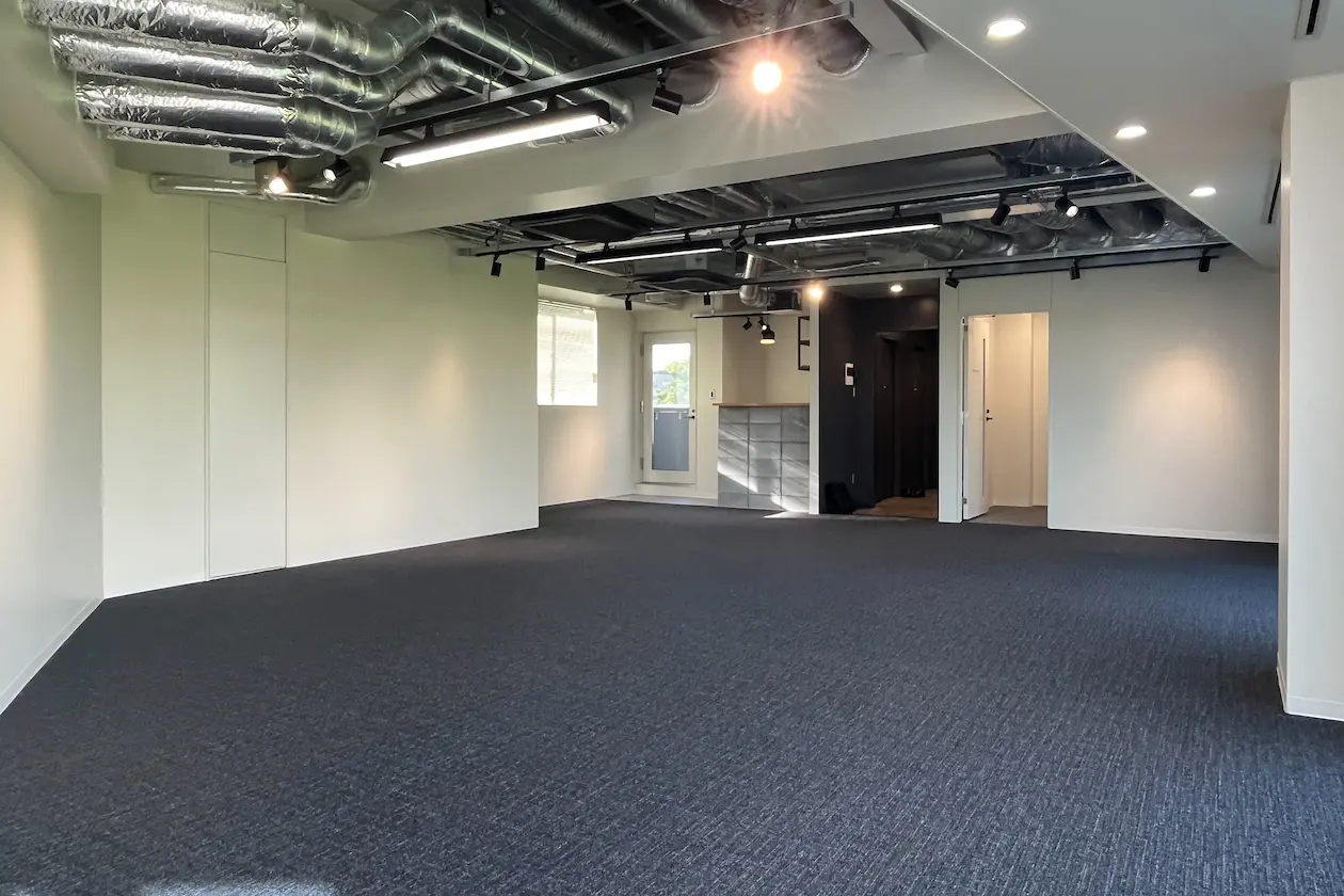 内装は白の壁紙にグレーのカーペット。天井は剥き出しの配管たちとレール照明がクールな印象。