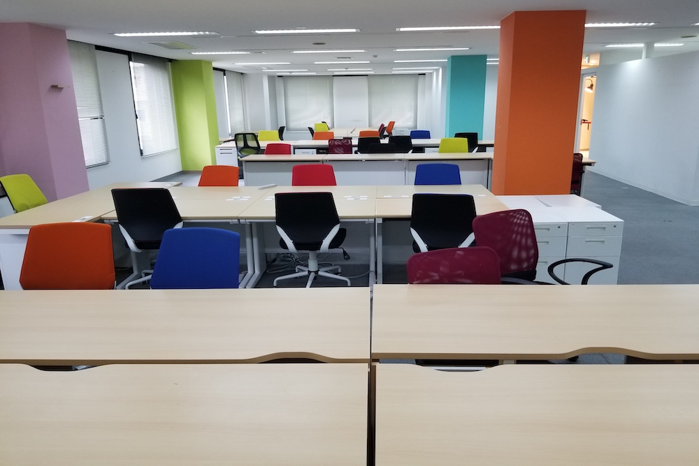 利便性が非常に高い、多彩な色使いが目を惹く会議室・フリースペース付き居抜きオフィス