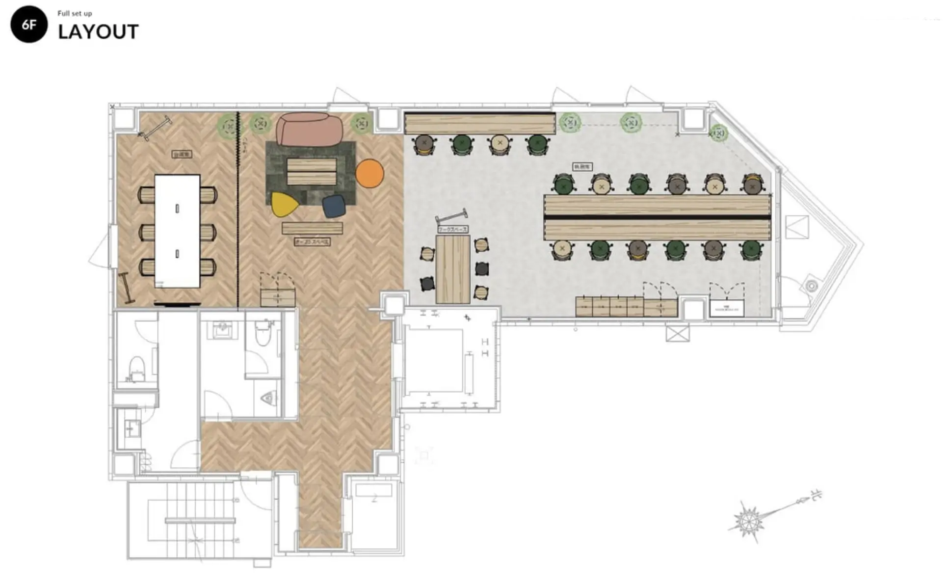 5階はどちらかというと無機質な空間に。深いブラウンのフローリングからは重厚感が感じられ、オープンスペースにあるグリーンが奥深い森林のような潤いある空間を演出しています。