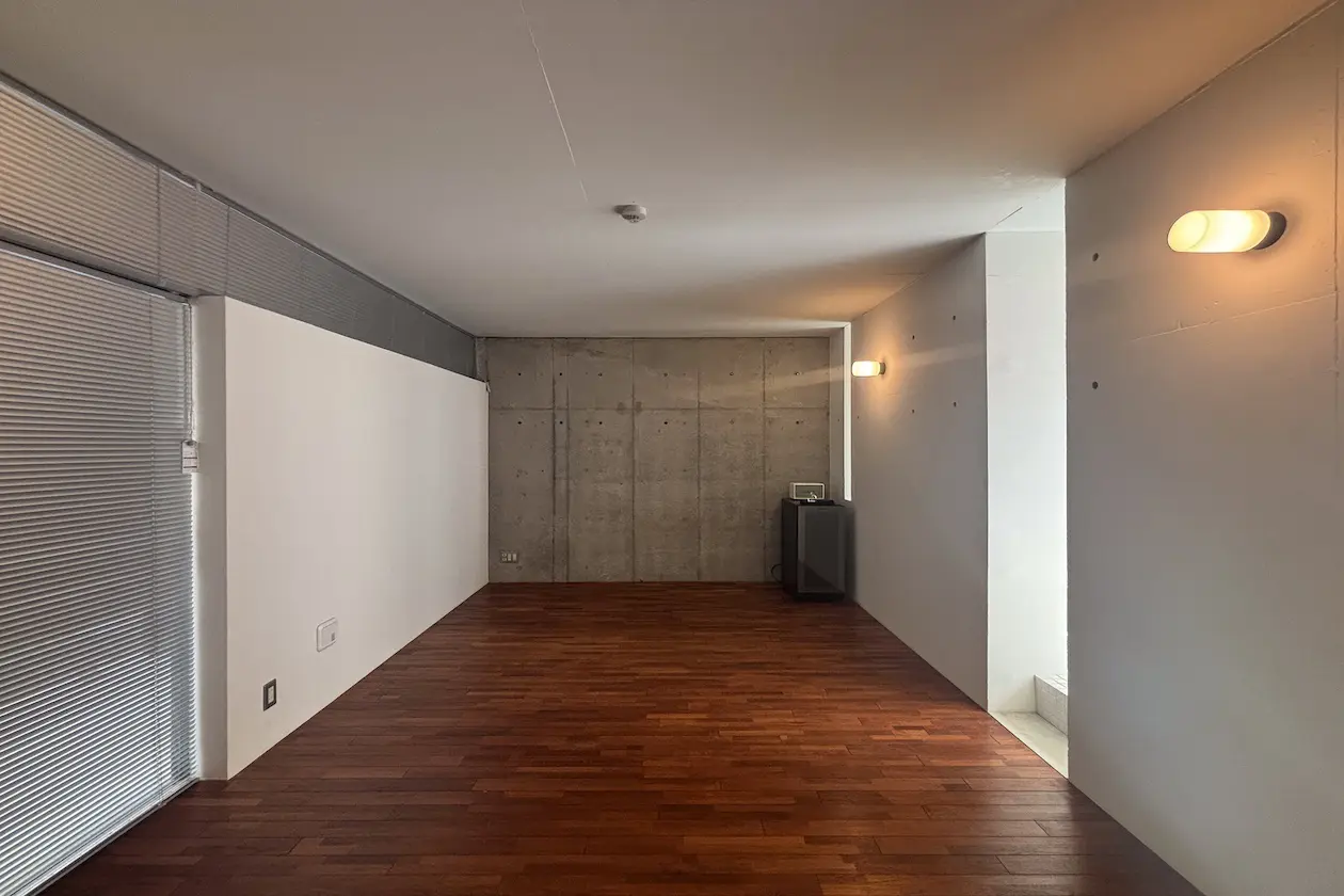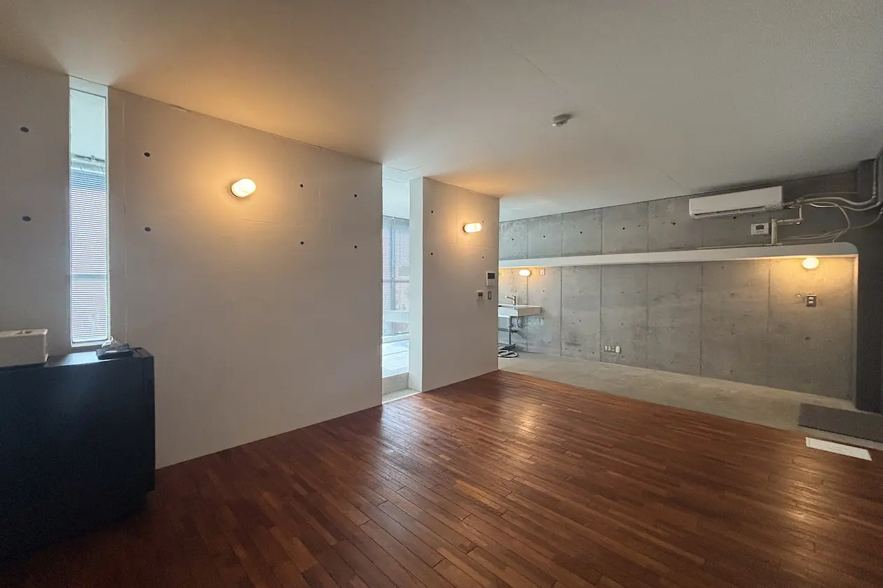 コンクリート打ち放しの壁と無垢フローリングで、シンプルな素材感が印象的です。