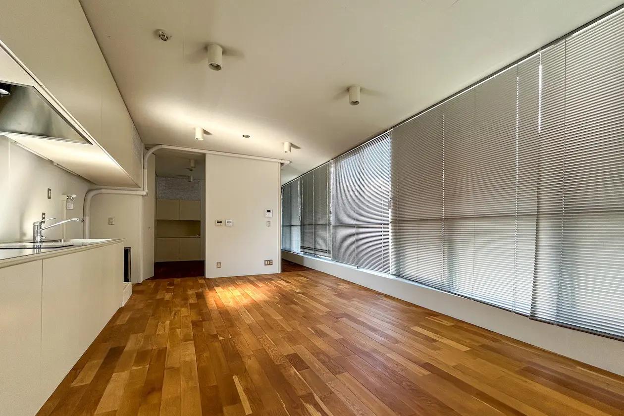 室内に入ると、まず目を引くのが大きな窓一面に広がるブラインド付きガラスファサード。