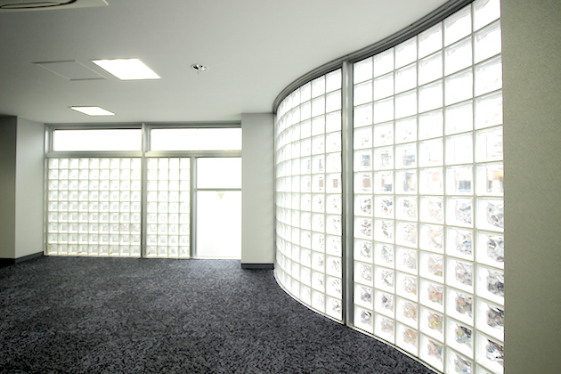 湾曲したガラスブロックも特徴のひとつ。外からの視線を妨げつつ、採光もしっかり確保されます。