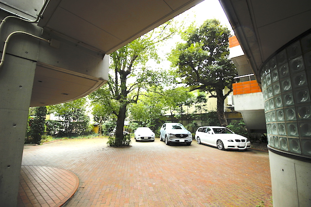抜けた先は中庭兼駐車場。緑に囲まれた心安らぐ空間です。