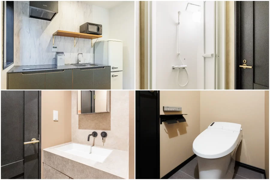 両区画にキッチン、シャワー、男女別トイレが付いており、高級感のあるシックなデザインです。