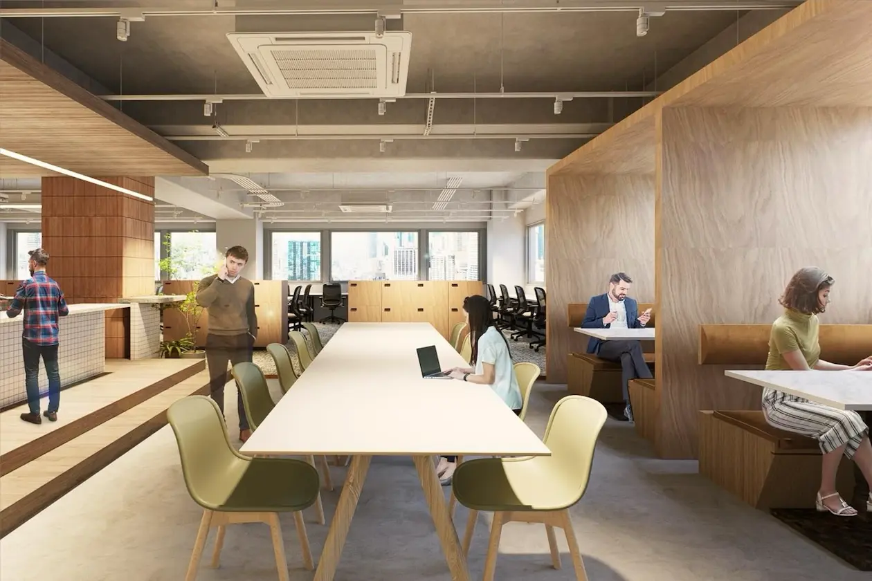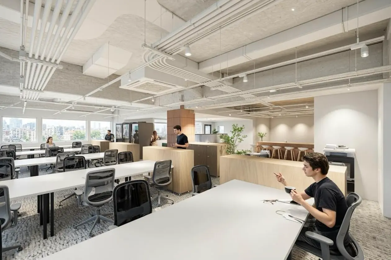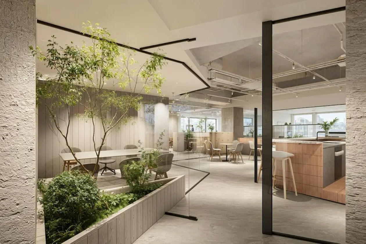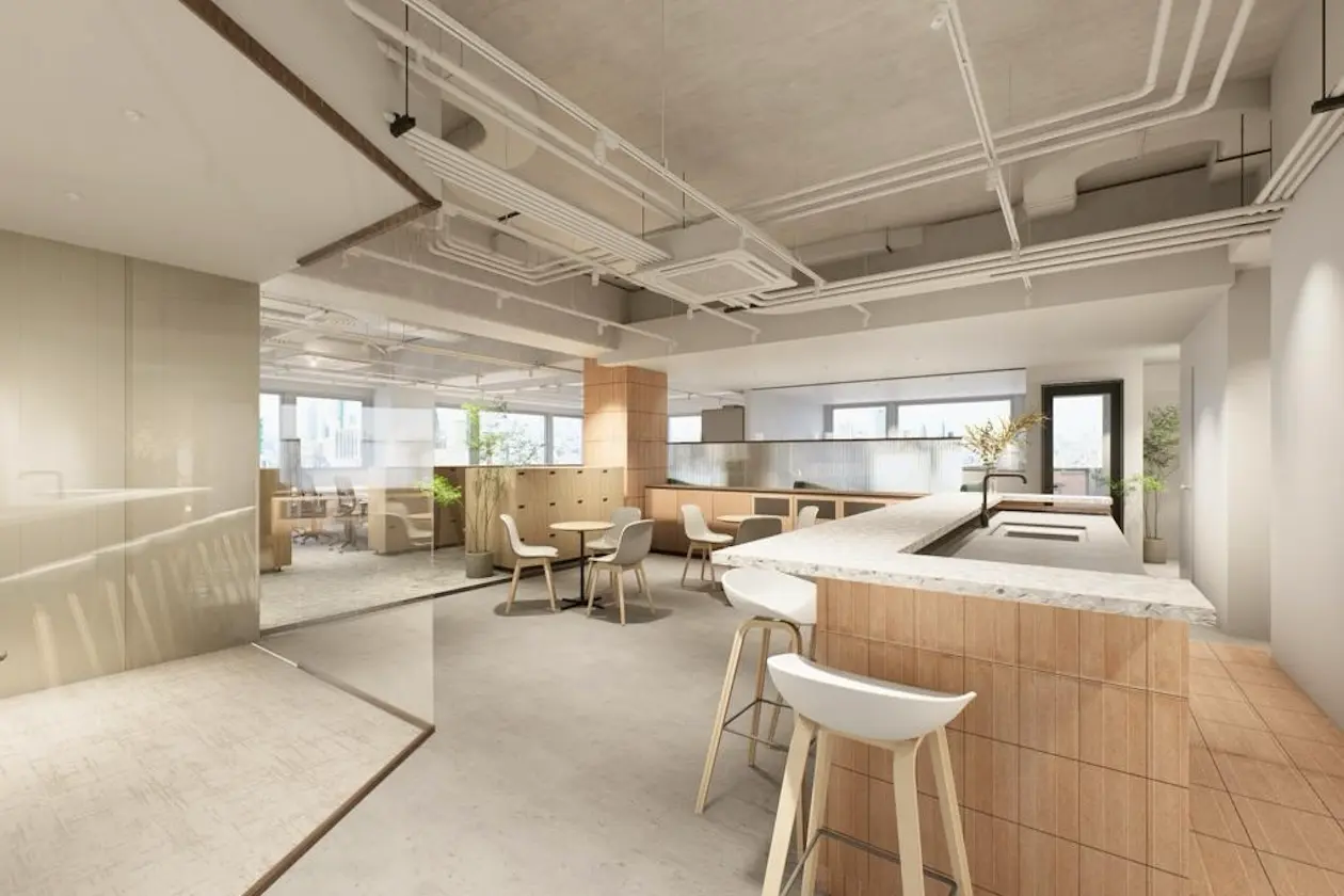 天井はスケルトン仕様で開放感を演出しつつ、間接照明や植栽が空間に柔らかさを加えています。来客対応や社内コミュニケーションの場としても機能する、ゆとりあるレイアウトです。
