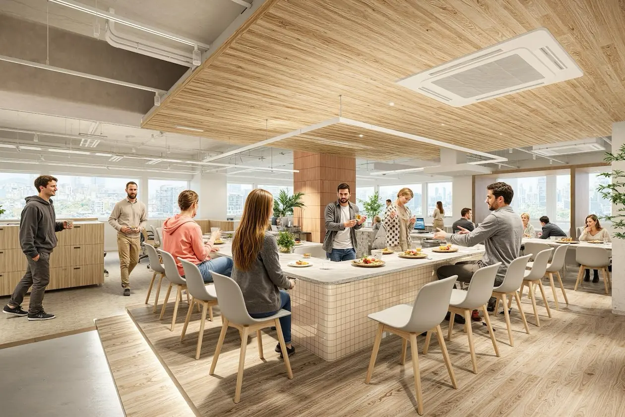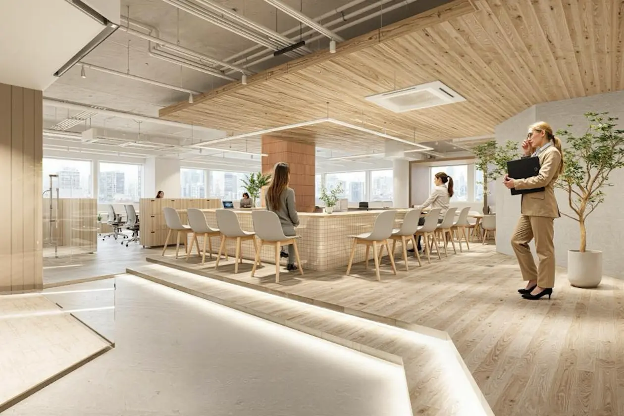 木目天井の下がり天井とタイル張りのアイランドキッチンが空間の主役。段差を活かしたゾーニングと間接照明が立体感を生み、オフィスでありながらカフェのような柔らかさを感じさせます。