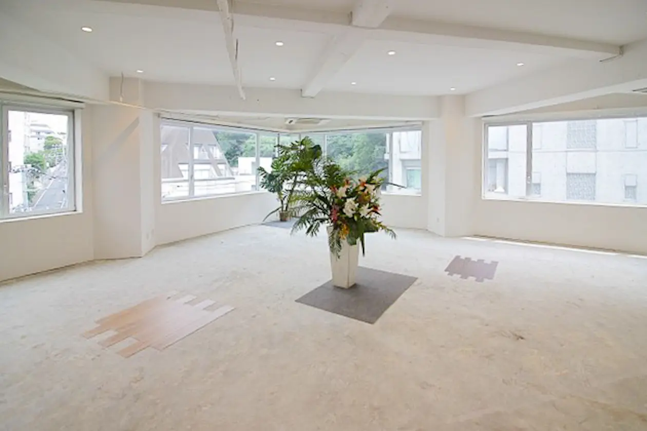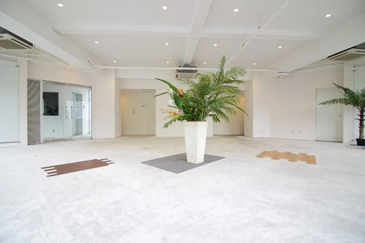 約110㎡の広々空間、ホワイト調の洗練ワンルームオフィス。