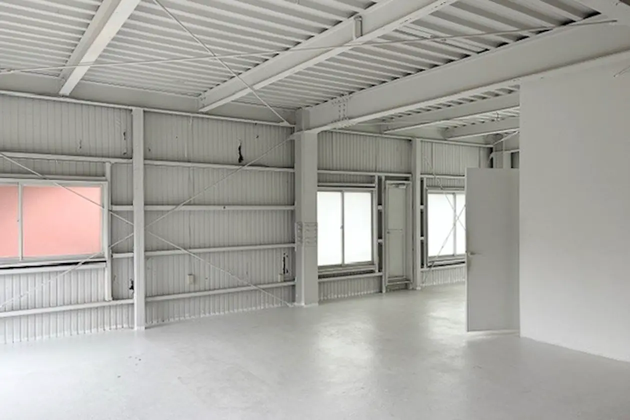 天井高は最大3mと、倉庫のような開放的な空間が最大の特徴で、スチール鉄骨の構造がそのまま見える無骨なデザインが、クリエイティブな業種のワークスペースに最適です。メインスペースは白く塗装されたスチール構造の天井が特徴的で、倉庫コンバージョンを思わせる開放的な空間です。