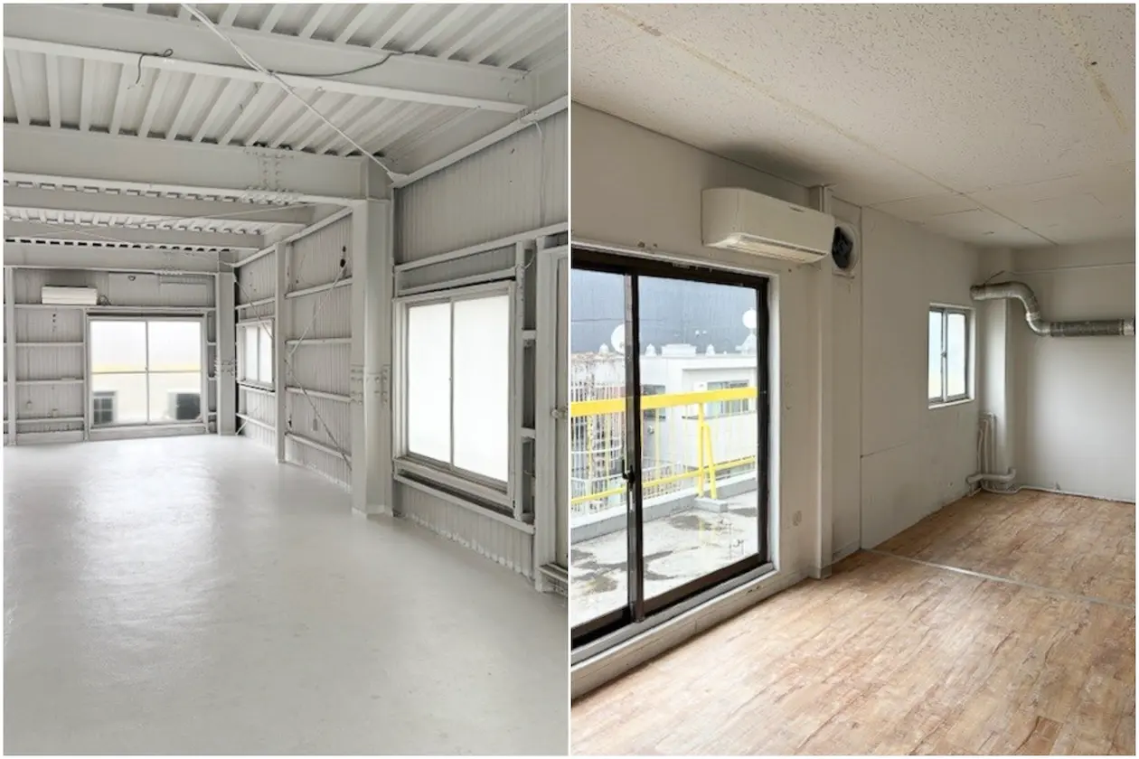 事務所としてデスクを並べる使い方はもちろん、クリエイティブなビジネスの拠点としても活用できます。メインスペースとは別に、木目調フローリングの個室スペースも備わっています。控室として利用がイメージできそう。