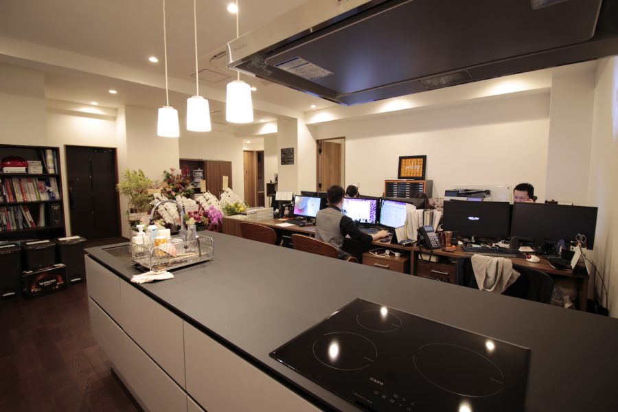 メインのワークスペースは34帖ののLDK、7名がゆったりと使えるレイアウトで利用されていました。