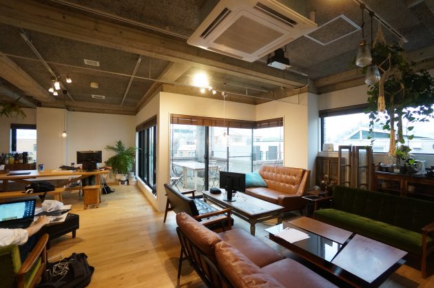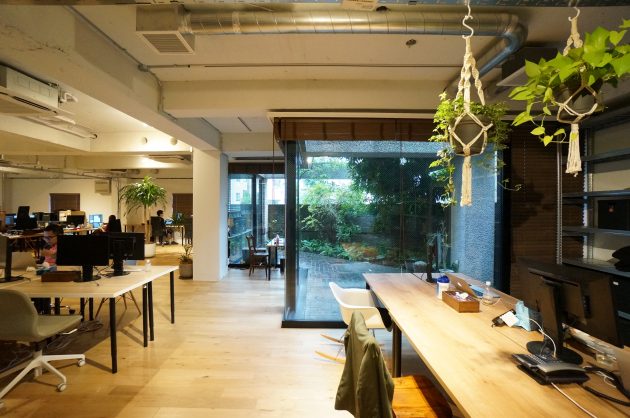 とてもお洒落なインテリアのセレクト。ソファを中心に置き、ラフに仕事ができる空間になっています。そしてなんと奥にはまた中庭があります。。