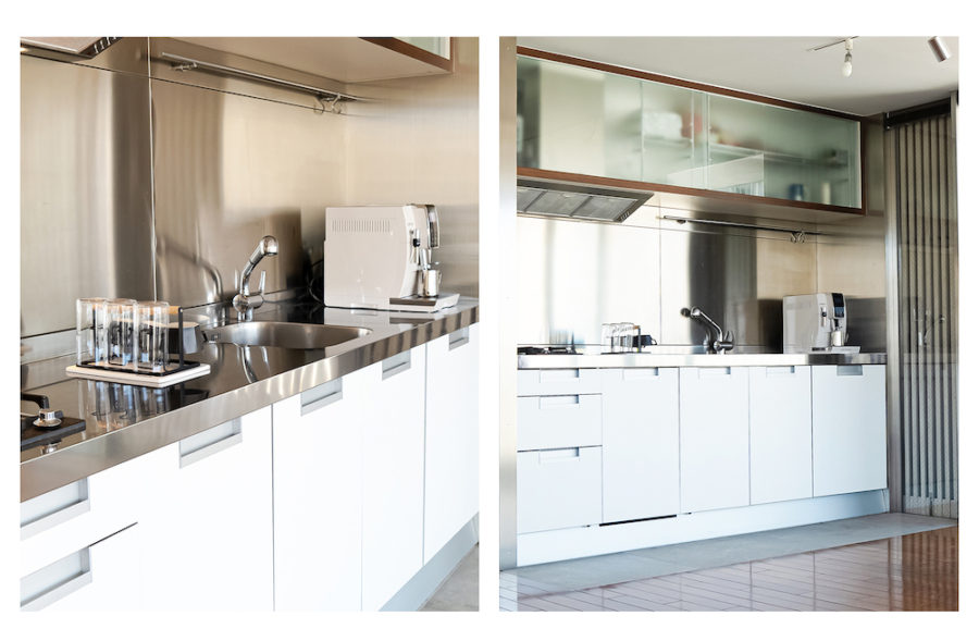 生活感を感じさせないオープンなキッチンスペースはデロンギのカフェマシーンを設置。