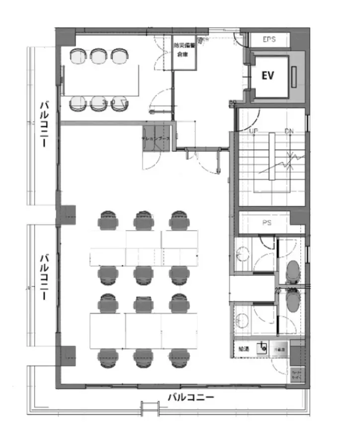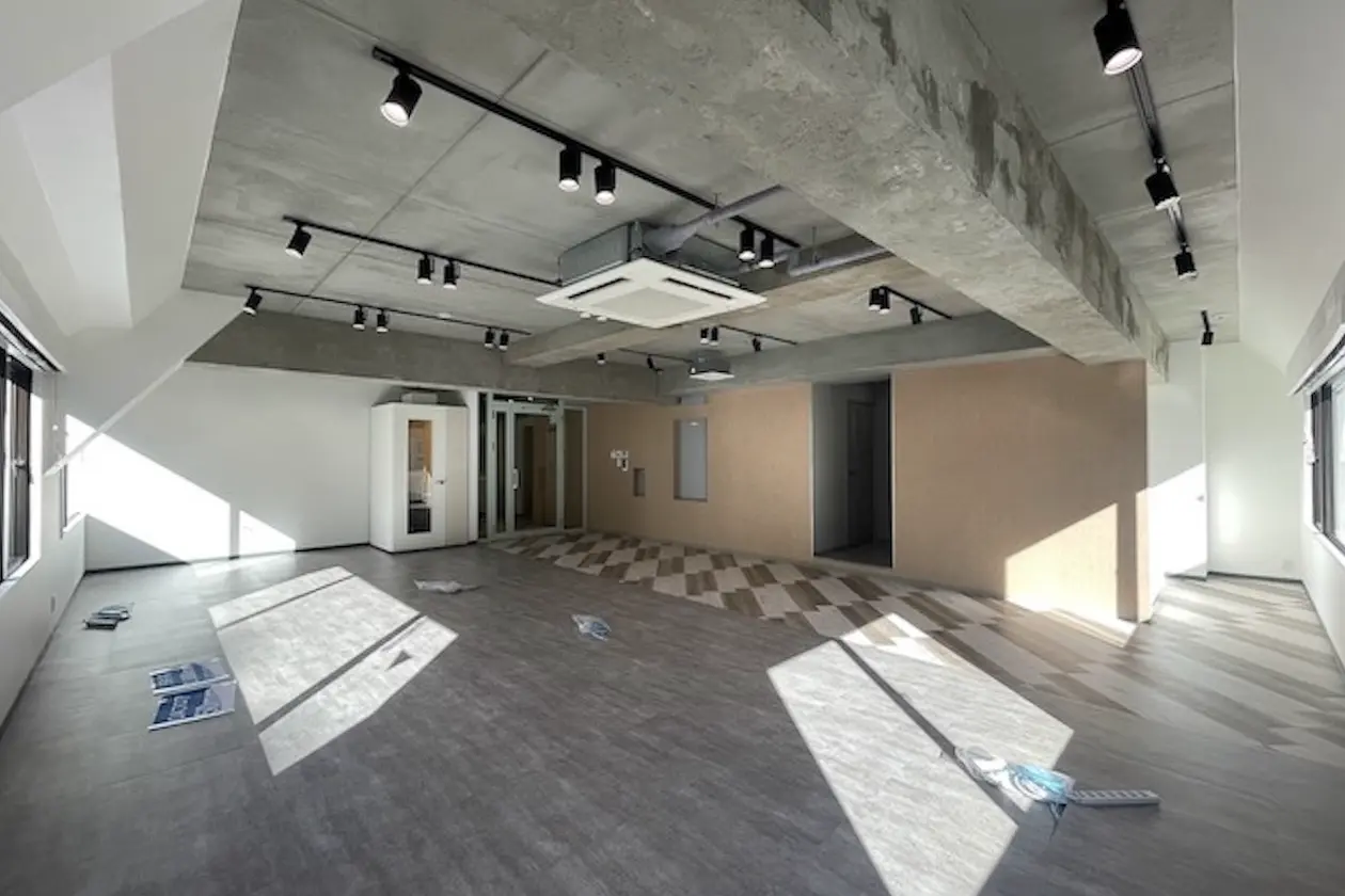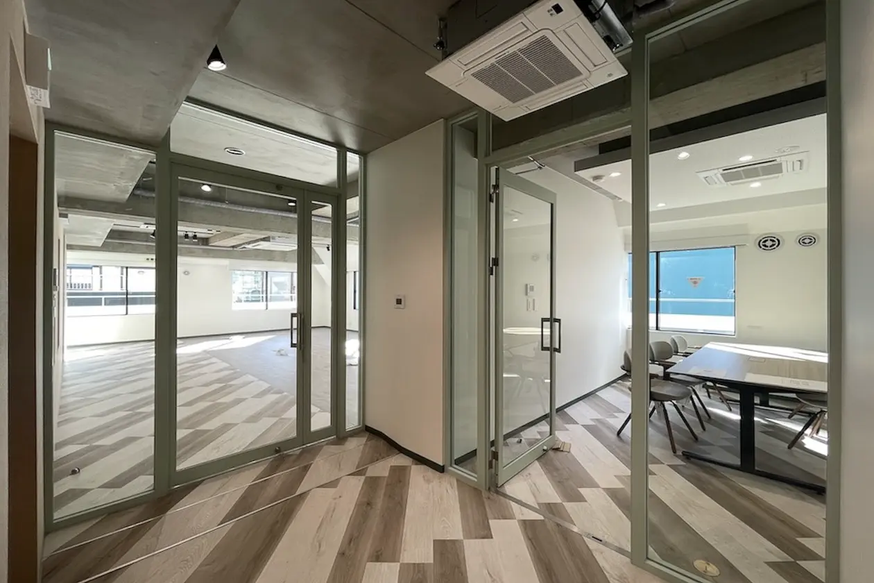 写真にはありませんが、執務室内什器12席用、会議室内什器6名用、テレカンブース設置をしたフルセットアップでの引き渡しとなります。