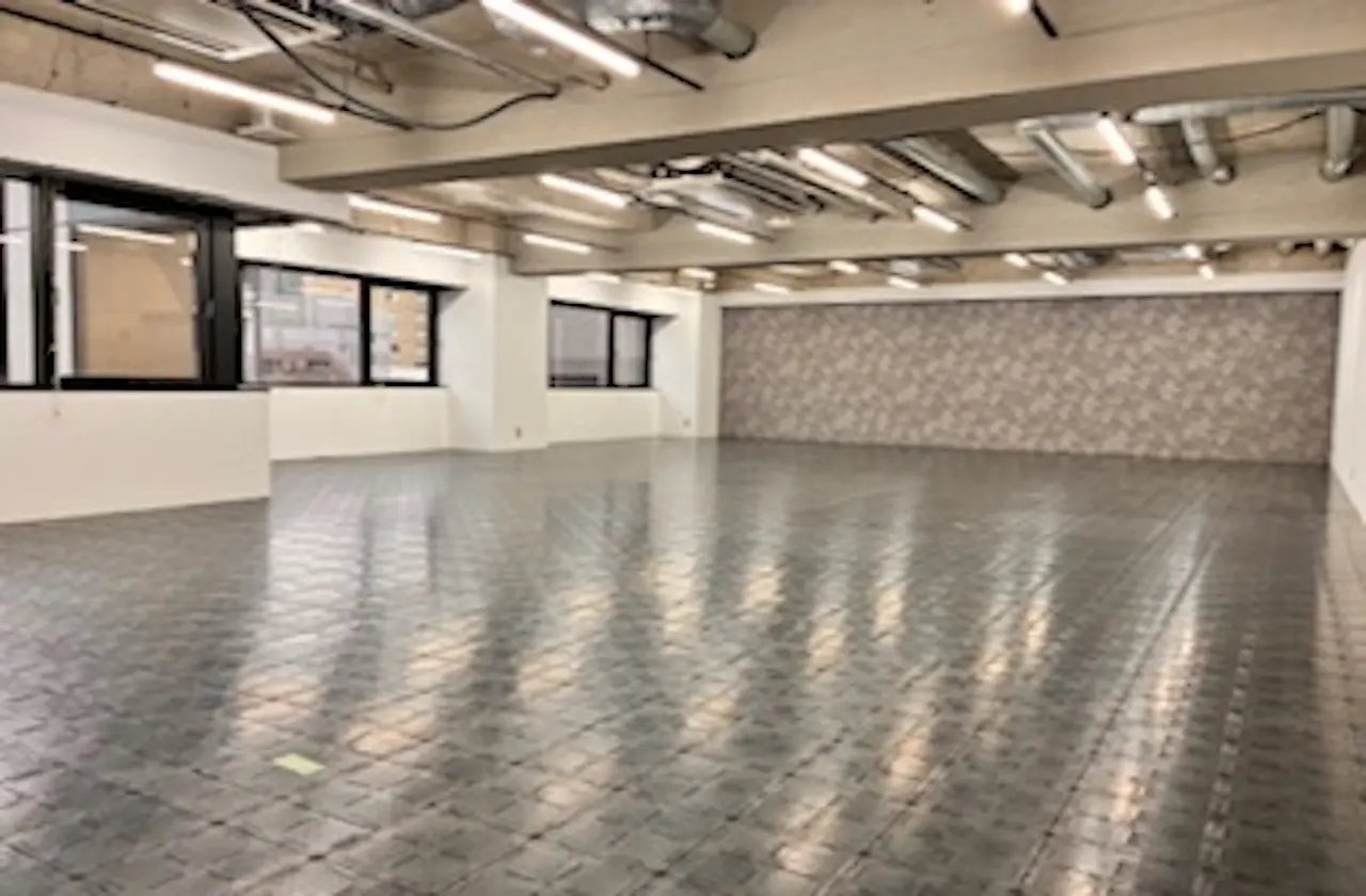スケルトン天井を取り入れたラフなデザインが空間に広がりを生み出し、木目調の床が温かみのある雰囲気を添えています。レイアウトの自由度も高く、少人数のオフィスはもちろん、クリエイティブなワークスペースとしても柔軟に活用できそうな一室です。