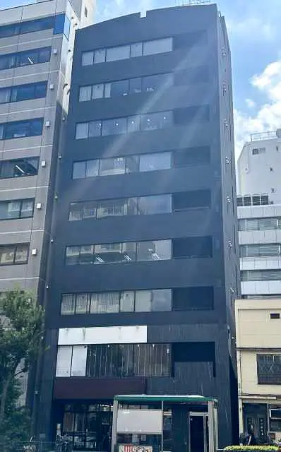 新大橋通り沿いにまっすぐ伸びる、ブラック基調の都会的なファサードが印象的なミドルサイズオフィス。