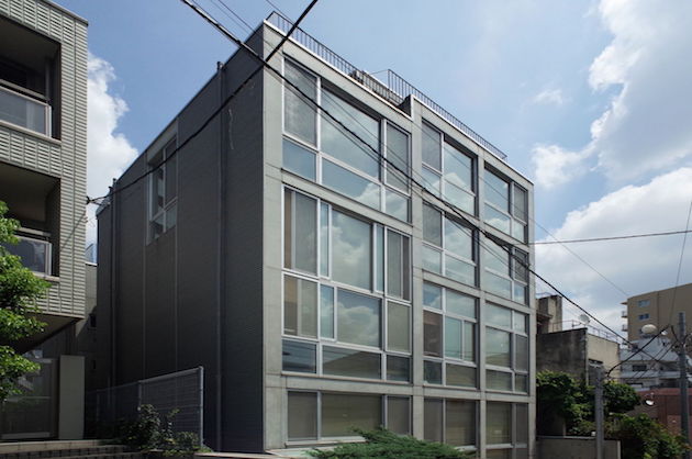 無機質なコンクリートに大きな窓がアシメントリーに施された外観。