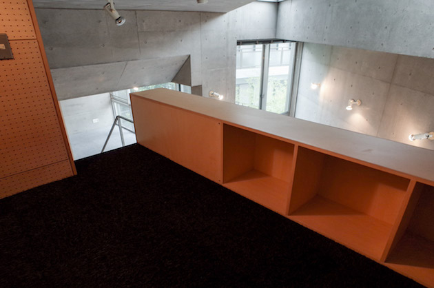 コンクリートとカーペットの寒色系と収納スペースと吸音材の暖色系の色合いのコントラストは絶妙。
