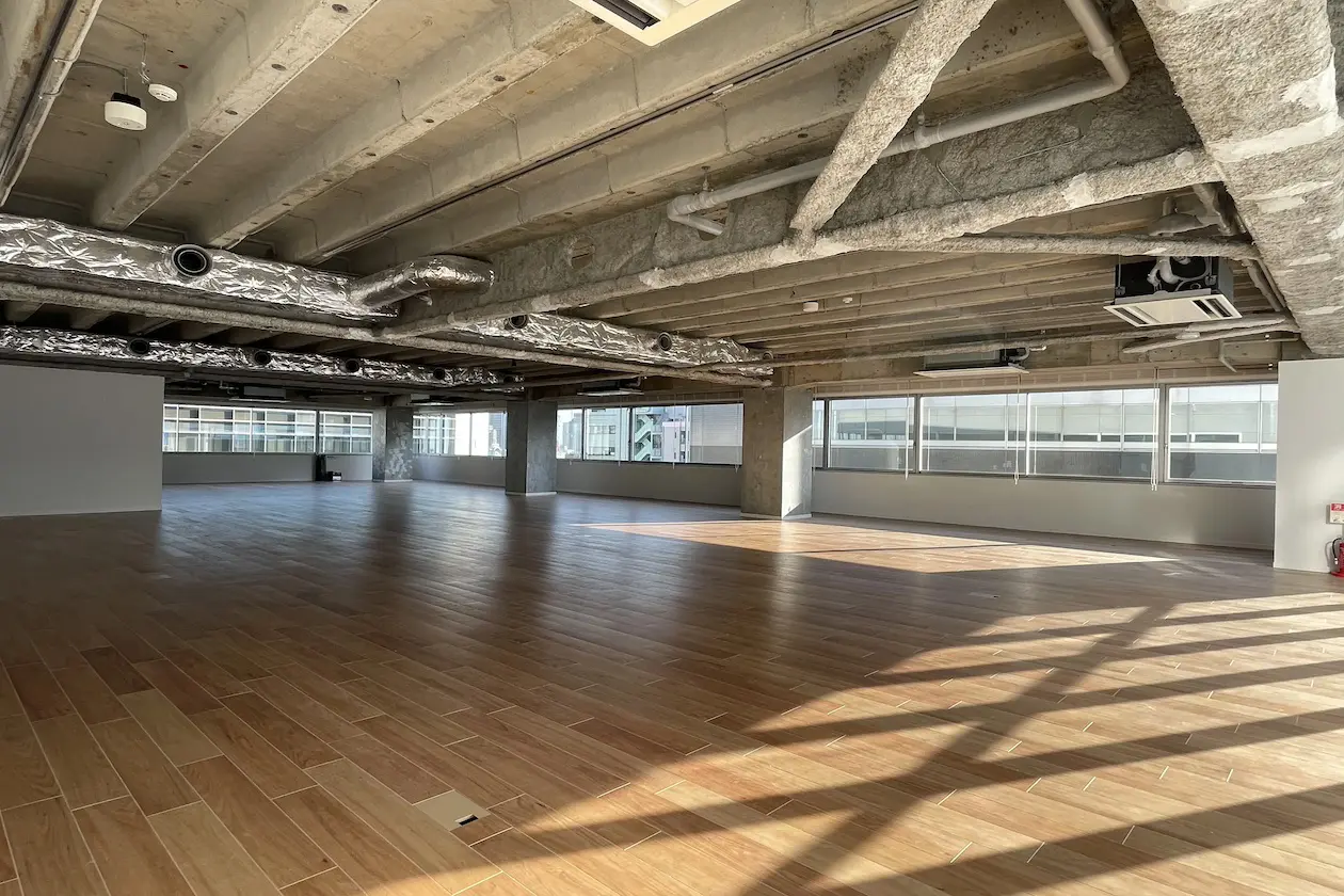 躯体表しの天井に白壁、OAフロア+天然木突板タイルのフローリングとモダンなオフィスにリノベーションされました。