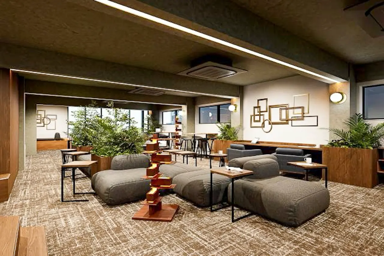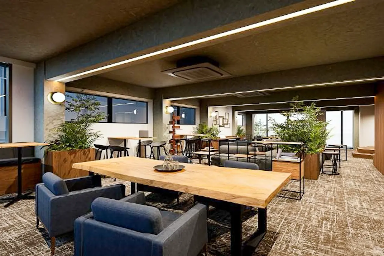 内装は、木目とグリーンが調和した、心地よいナチュラルモダンなセットアップオフィス。