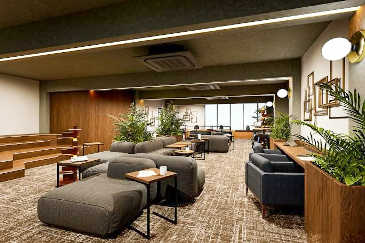 天井高のある空間に、落ち着いたトーンのインテリアと木質感のある素材を組み合わせ、ラウンジのような居心地と集中できる静けさを両立。