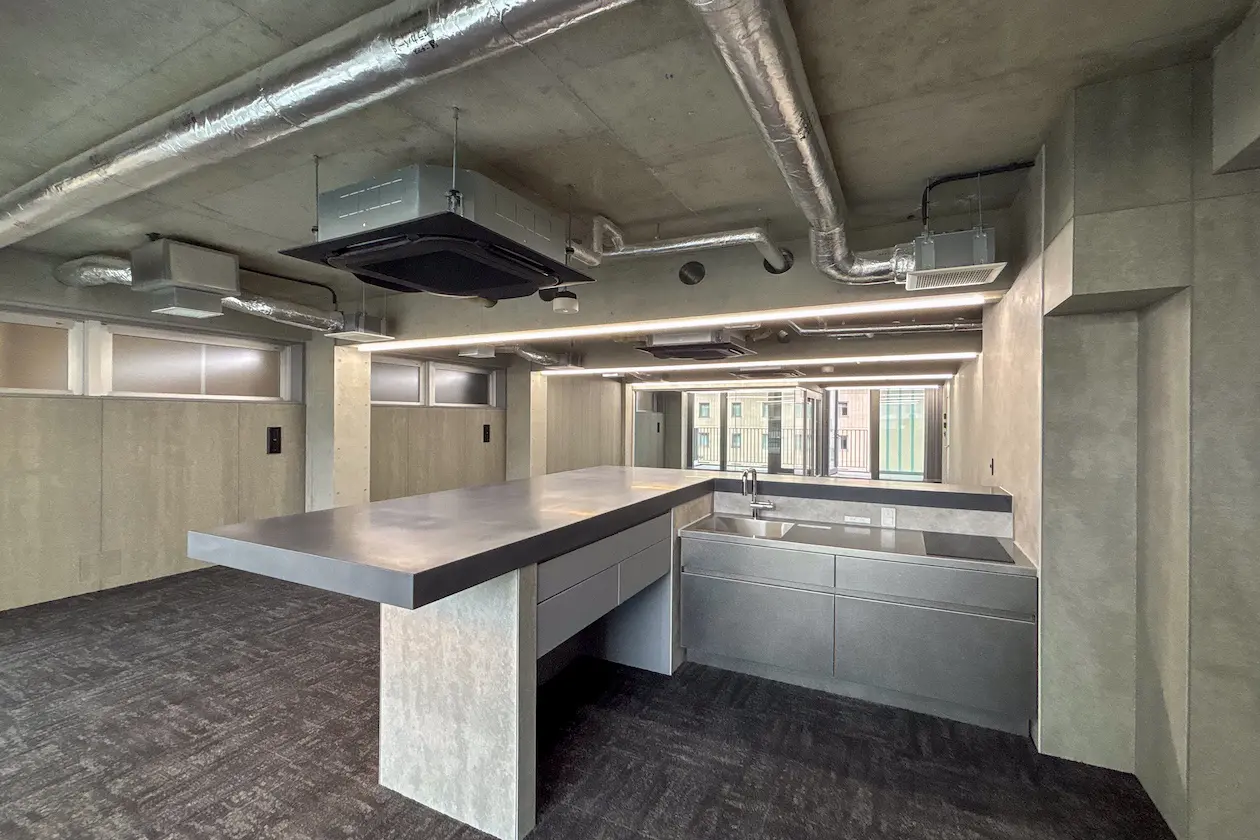 存在感のあるカウンターキッチンが空間の中心に据えられた、開放的なワークスペース。無機質な素材で統一されたデザインが、洗練された印象と落ち着きをもたらします。