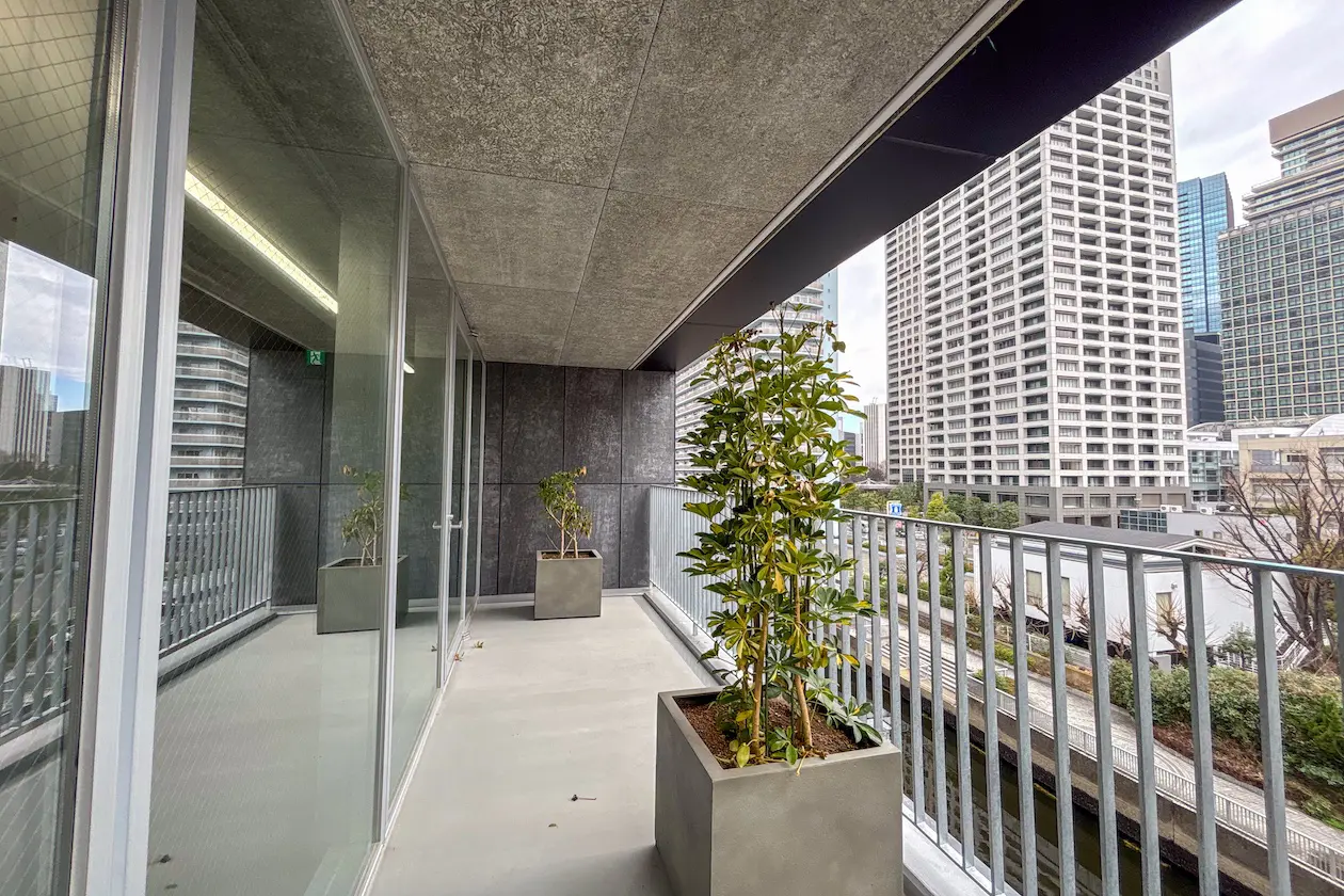 芝浦運河に面した側には、フロアごとにバルコニーが設置されており、水辺の景観を楽しみながら打ち合わせや休憩時間を過ごせます。