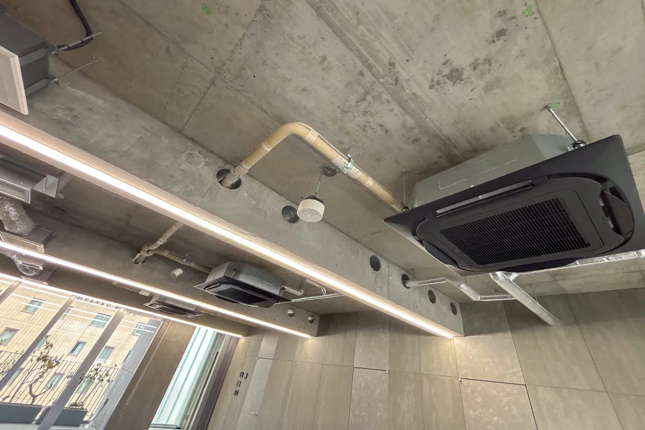 天井はコンクリート打ち放しのスケルトン仕様で、素材そのもののラフな表情が空間に力強さを与えています。配管やダクトをあえて見せることで、無機質ながらもデザイン性の高いインダストリアルな印象に。