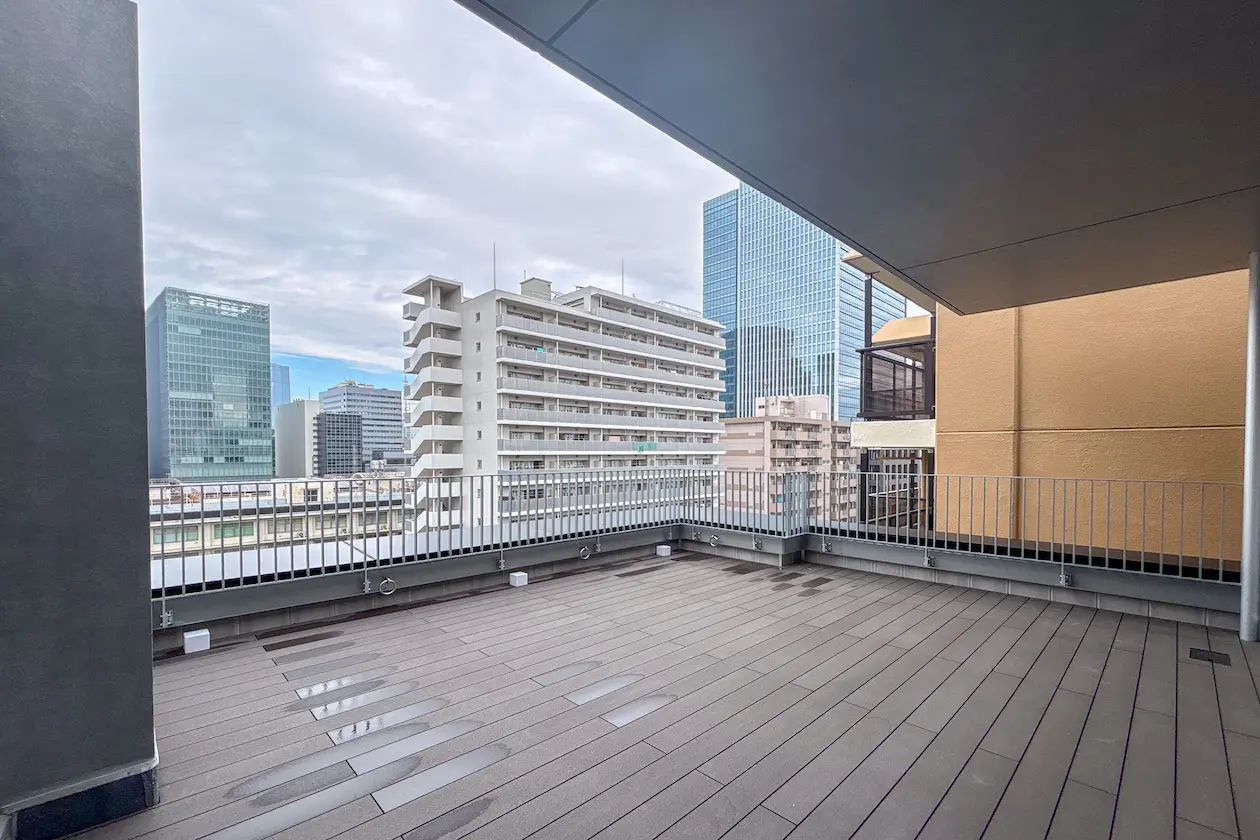ガラス面に沿って伸びるバルコニーは、視界が大きく開けた心地よい外部空間。プランターのグリーンがさりげなく配置され、都心の景色の中にやわらかなアクセントを添えています。