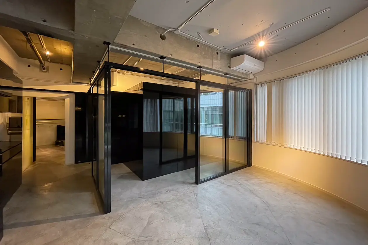 元々靴屋のショールームとして使用されていた前テナントの居抜き募集であった本区画は、室内上部の壁面収納やピアノブラックのストレージ家具がそのまま残置された状態でした。