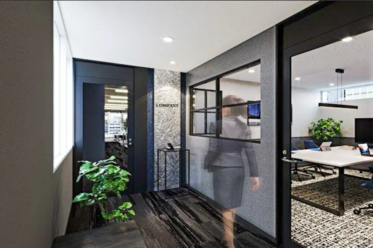シックな素材を組み合わせたエントランスは、企業の顔として十分な品格。ガラス窓越しに室内の様子がわずかに見えるため、閉じすぎず、開きすぎない絶妙な温度感です。