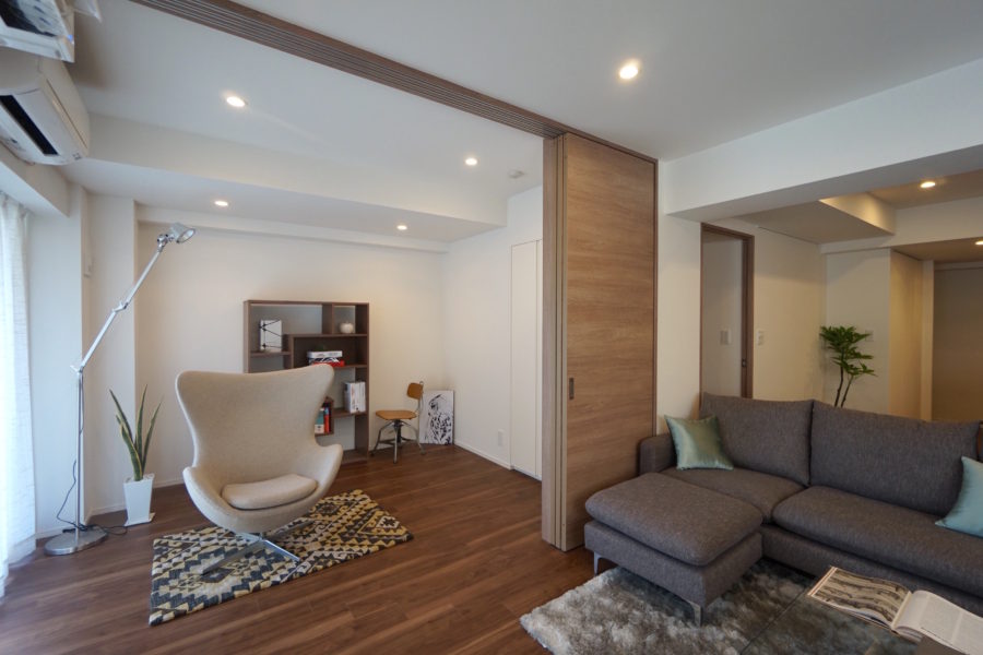 室内は落ち着いた色味で統一されたモダンな内装。洗練された上品な空間が広がります。間取りは3LDK。こちらは15帖ほどのリビングルームです。