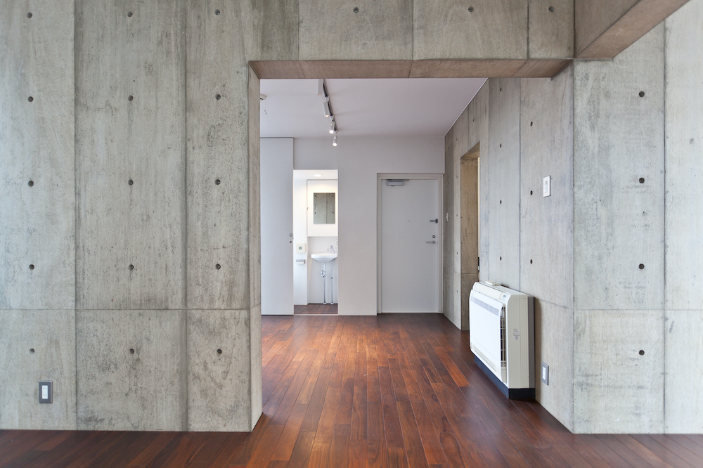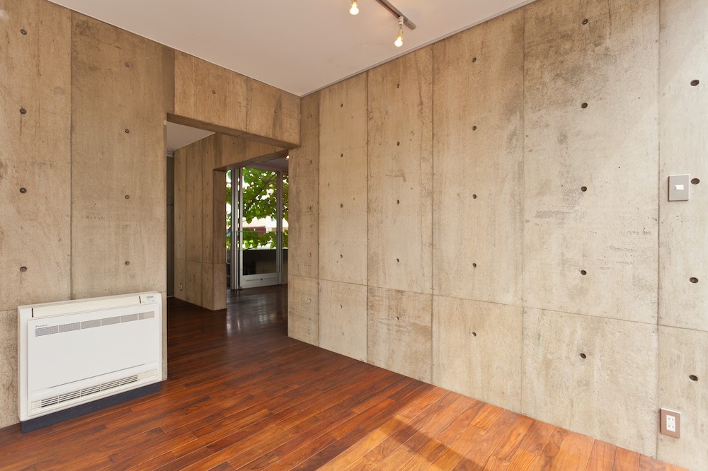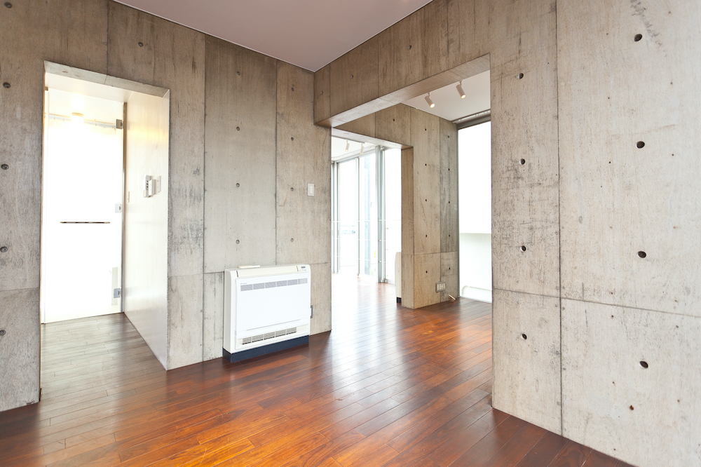 無機質な打放しコンクリートとフローリングの木の温かみのコントラストが印象的ですね。