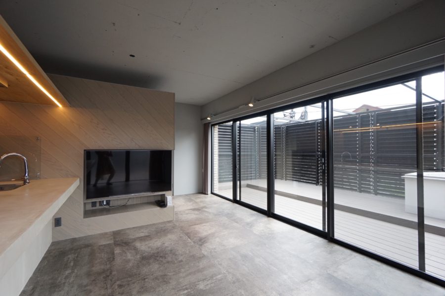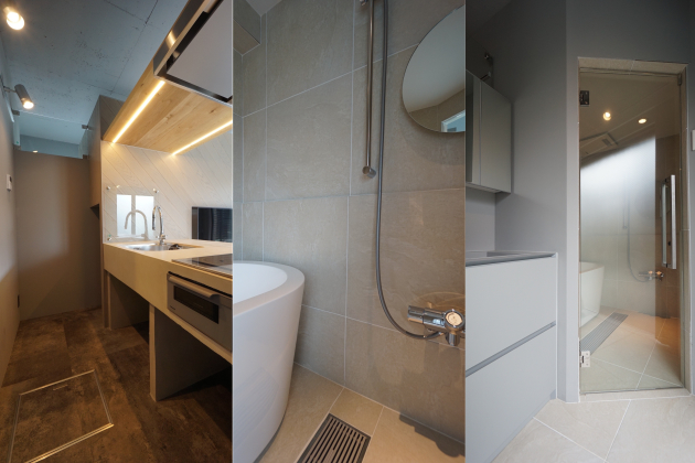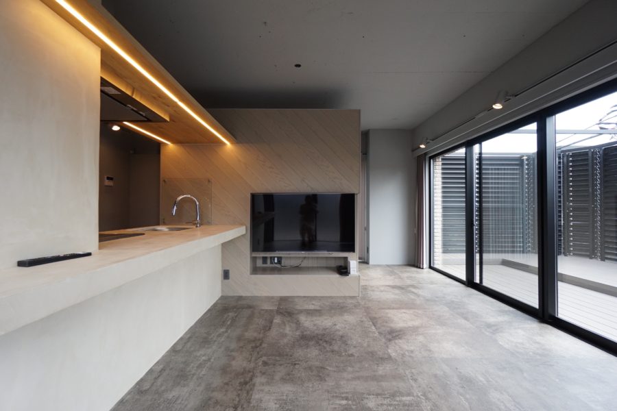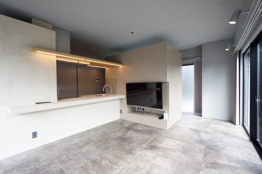 モルタル風のPタイルが敷かれたモダンススタイリッシュな空間に仕上がっています。