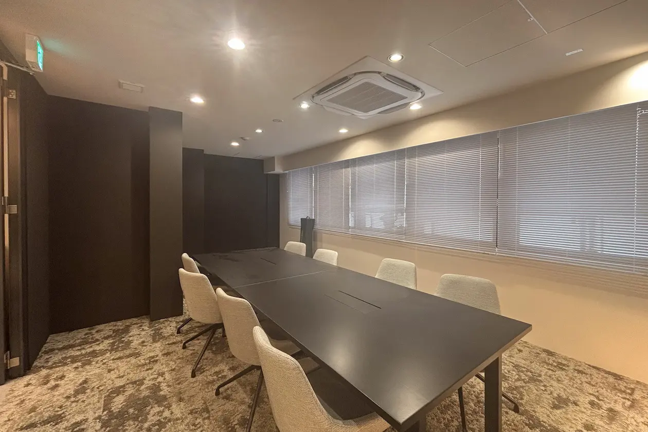 こちらは4F,5Fどちらにも設置されている会議室です。黒のテーブルが空間を引き締め、洗練された雰囲気です。8名で利用することができ、商談や社内ミーティングで利用することができます。