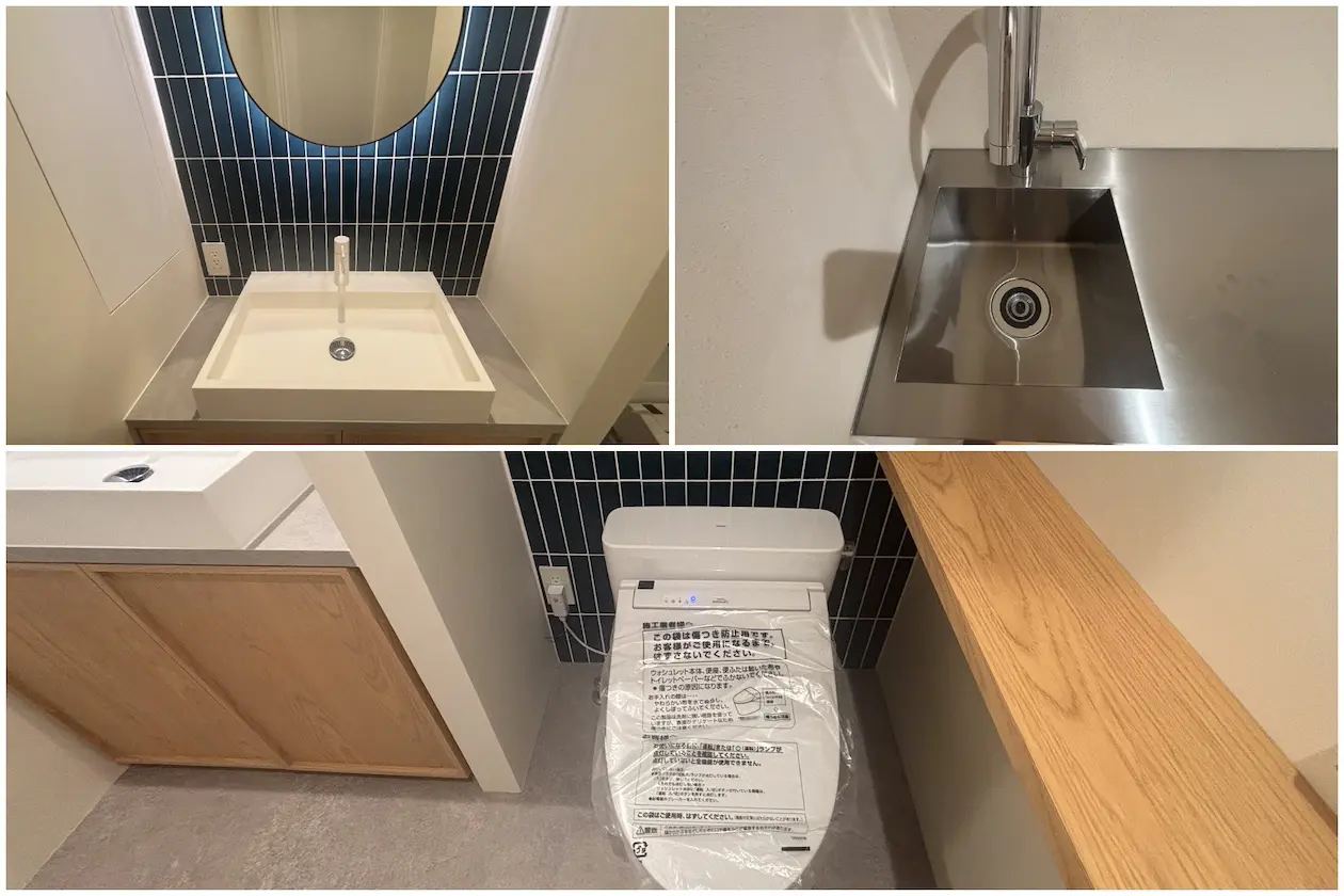 白・木目基調に紺タイルが映える清潔感ある水回り。使い勝手の良さも魅力です。