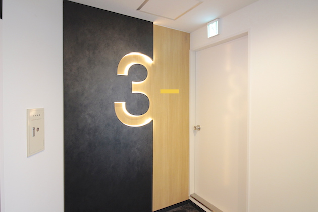 エレベーターホールはリニューアルされ、階数を示す大きな数字がインパクト大です。