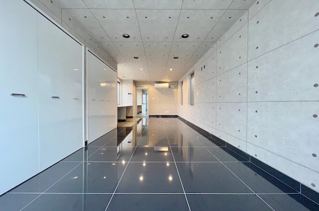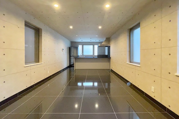 こちらは2階の20帖のLDK。奥行きが十分にあるオープンキッチンが特徴的な空間。壁はコンクリートでカジュアルな感じもありますが、床が大理石なので空間に上品な印象を与えてくれます。