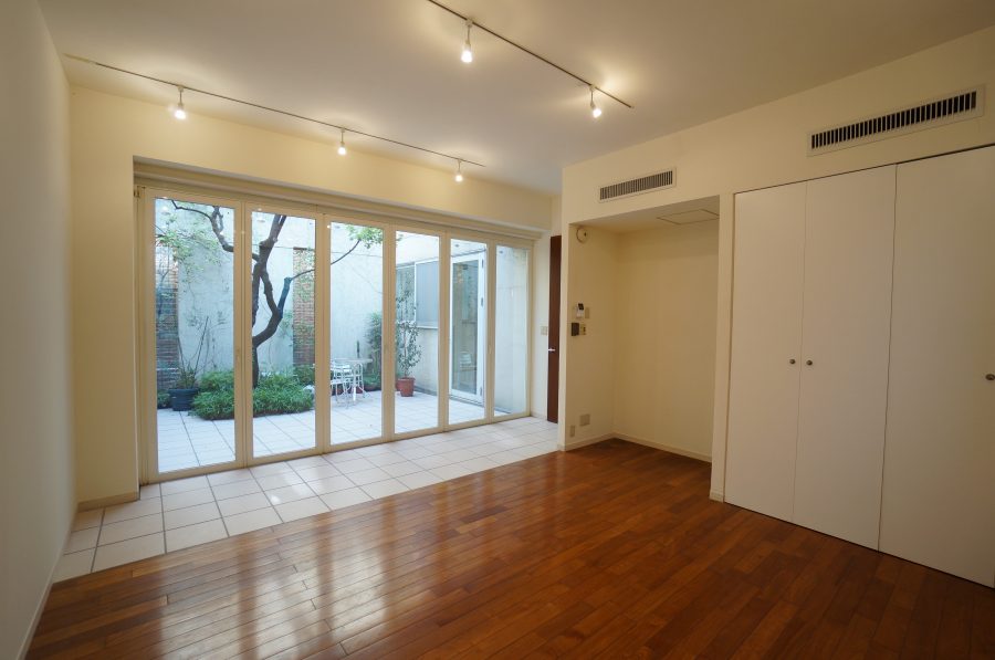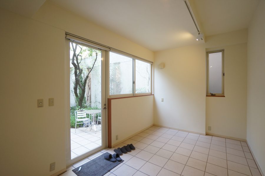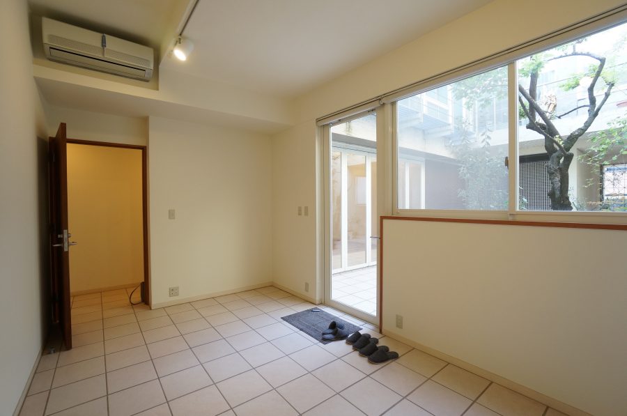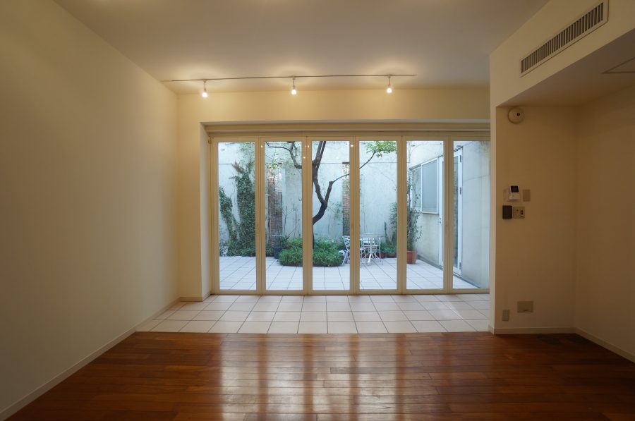 中庭が見渡せるため、平米数以上の広さに感じられる気持ちの良い空間。