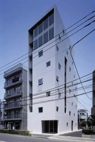 ホワイトを基調とした長方形のファザードと窓の配置がアシンメトリーのアクセント。