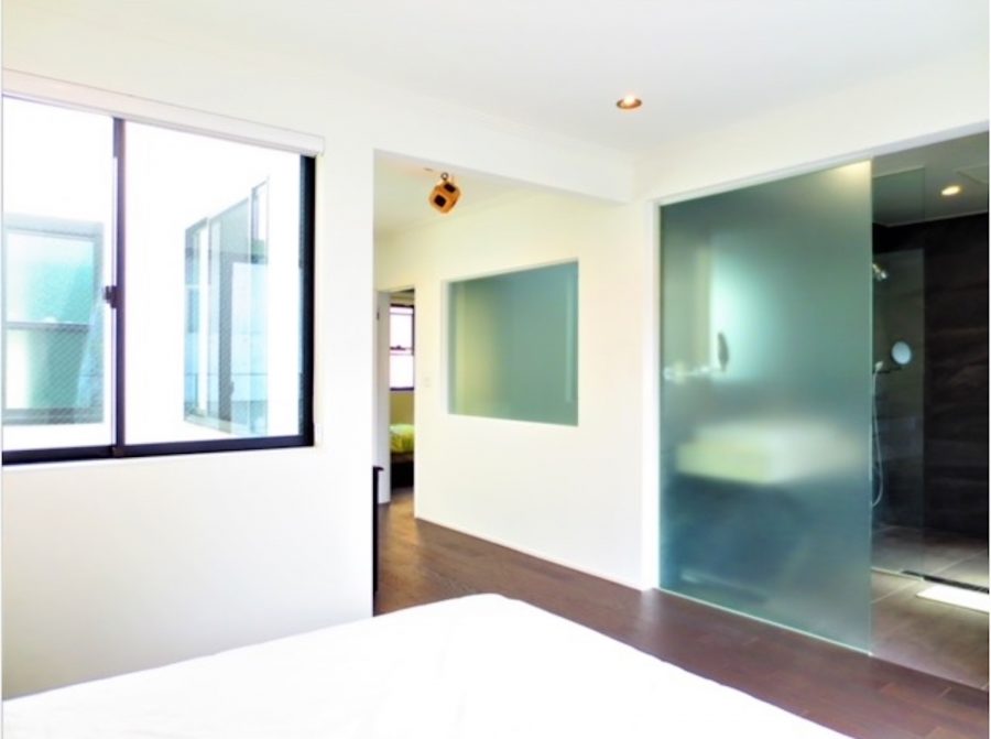 浴室はガラス張りでしゃれた印象を与えます。