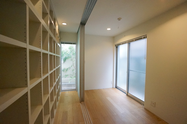 エントランスを入ってすぐに現れるのは壁一面の収納とスライディングウォールで区切ることが出来る3帖程のサービスルーム。